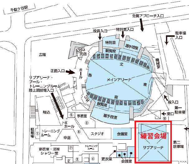 6月3日(金)の練習会場(サブアリーナ)は12:30開場、13:00練習開始となります。
